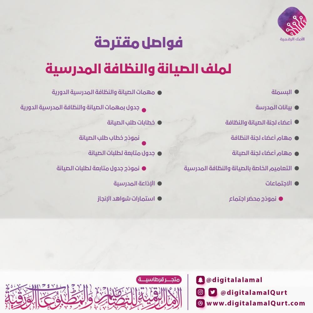 هذا الملف يساعد إدارة المدرسة ولجنة الصيانة في تنظيم البيانات والمهام والاجتماعات والتعاميم والنماذج الرسمية بطريقة مرتبة وسهلة الوصول.